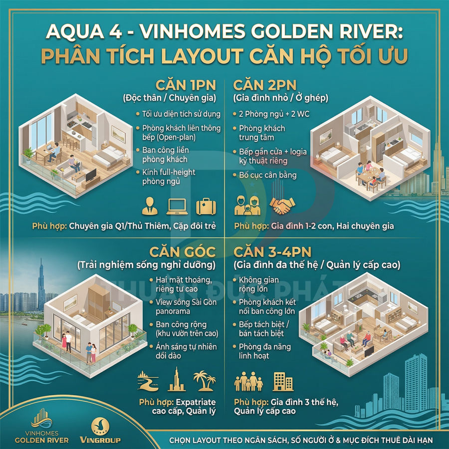 Layout căn hộ Aqua 4 được thiết kế theo chuẩn căn hộ cao cấp trung tâm, chú trọng tối ưu từng mét vuông sử dụng, giảm diện tích giao thông và hạn chế góc chết. Không gian được phân tách rõ giữa khu sinh hoạt chung và khu riêng tư, tạo sự cân bằng giữa kết nối và riêng tư cho gia đình, chuyên gia và expatriate. Các loại căn 1–4PN được tổ chức linh hoạt theo nhóm khách thuê: độc thân, cặp đôi, gia đình nhỏ, gia đình đa thế hệ, quản lý cấp cao. Căn góc view sông Sài Gòn với hai mặt thoáng, ban công rộng, ánh sáng tự nhiên dồi dào mang lại trải nghiệm sống như nghỉ dưỡng. Việc chọn layout cần cân nhắc ngân sách, số người ở và mục đích thuê dài hạn để tối ưu công năng và chi phí.