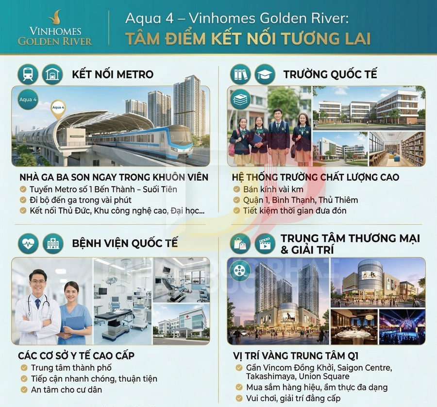 Vinhomes Golden River là một trong số rất ít dự án tại trung tâm Quận 1 có tuyến metro đi qua, tạo nên lợi thế vượt trội về kết nối giao thông công cộng trong tương lai. Tuyến metro số 1 Bến Thành – Suối Tiên với nhà ga Ba Son nằm ngay trong khuôn viên dự án giúp cư dân Aqua 4 có thể tiếp cận trực tiếp hệ thống metro mà không cần di chuyển xa. Điều này mang lại nhiều giá trị: