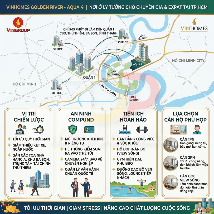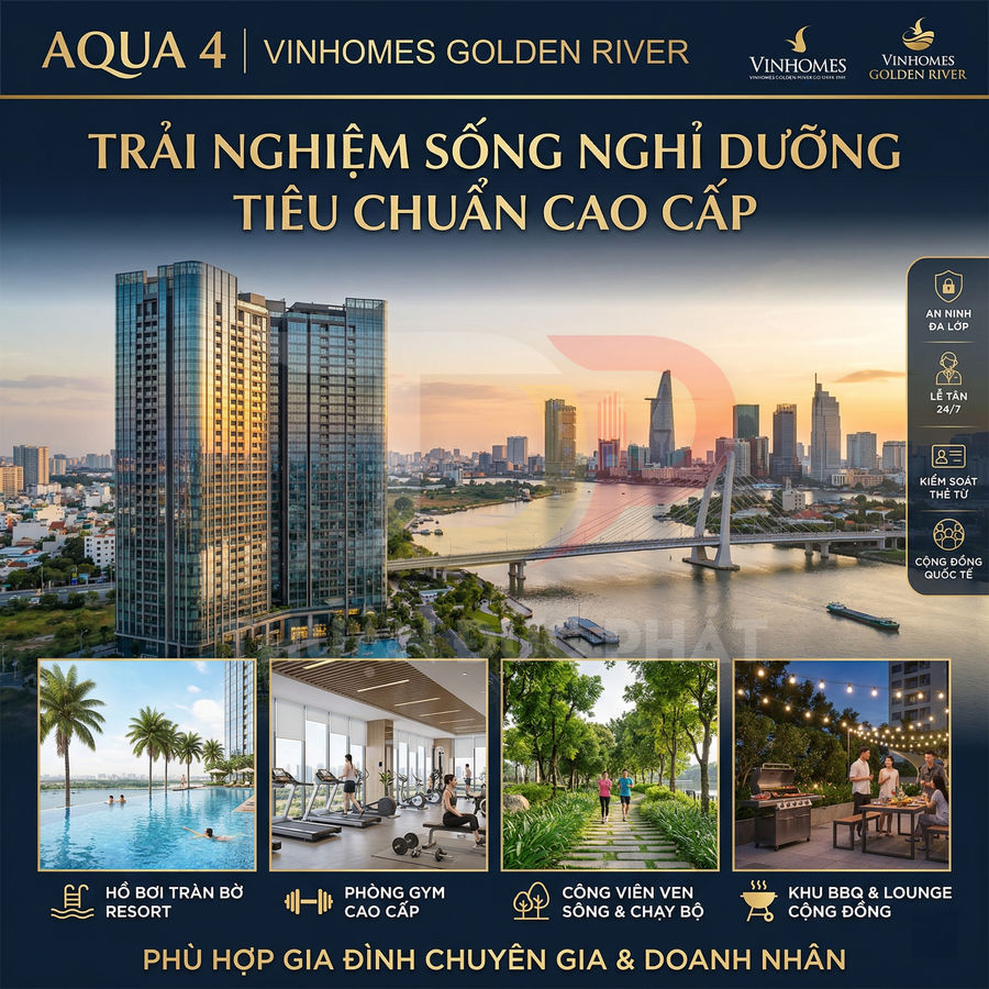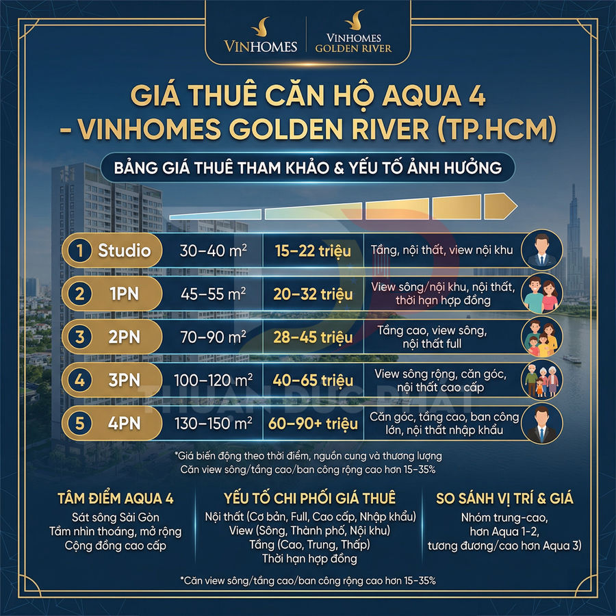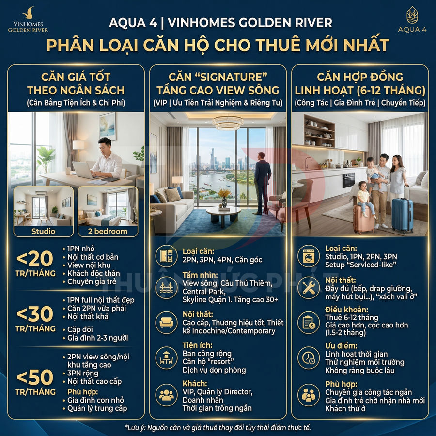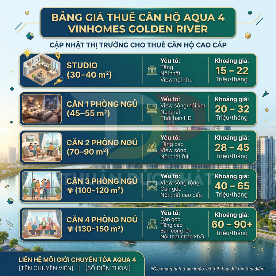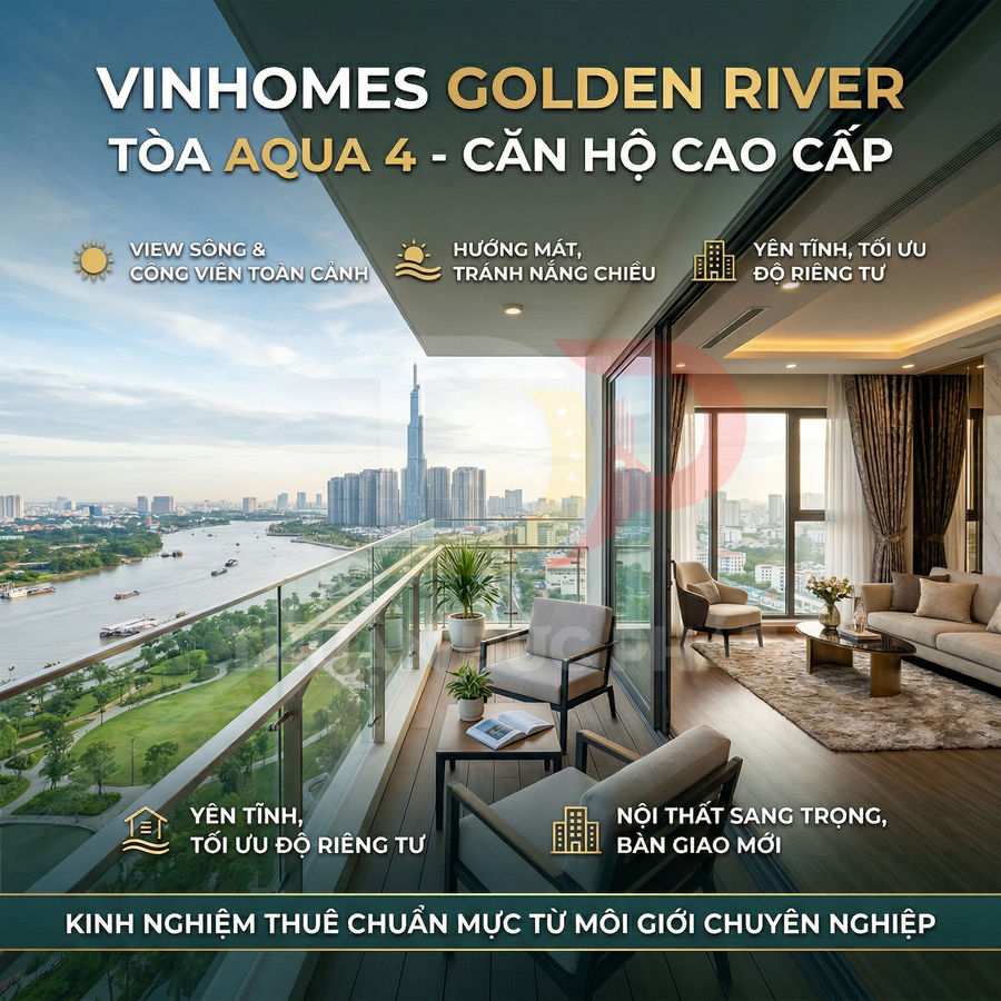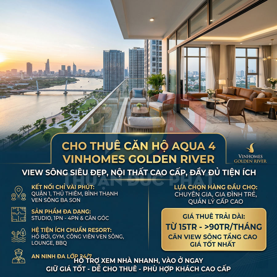 Aqua 4 tại Vinhomes Golden River là lựa chọn thuê căn hộ cao cấp nổi bật dành cho chuyên gia, gia đình trẻ, expatriate và quản lý cấp cao nhờ lợi thế vị trí ven sông Ba Son, kết nối cực nhanh đến Quận 1, Thủ Thiêm và Bình Thạnh. Nội dung tổng thể cho thấy dự án sở hữu dải sản phẩm rất rộng từ studio, 1PN đến 4PN và căn góc view sông, đáp ứng linh hoạt nhiều nhu cầu từ tối ưu ngân sách đến tiêu chuẩn sống hạng sang. Mức giá thuê trải dài khoảng 15 triệu đến hơn 90 triệu/tháng, biến động theo diện tích, tầng, hướng view, độ mới và mức hoàn thiện nội thất; trong đó các căn tầng cao, view sông, full nội thất cao cấp luôn giữ mức giá và thanh khoản tốt hơn.