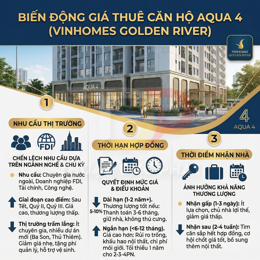 Trong các giai đoạn thị trường trầm lắng, lượng chuyên gia nước ngoài giảm, hoặc khi có nhiều dự án mới bàn giao quanh khu vực Ba Son – Thủ Thiêm, giá thuê Aqua 4 có thể điều chỉnh nhẹ để duy trì tỷ lệ lấp đầy. Một số chủ nhà chấp nhận giảm giá, tặng kèm phí quản lý 6–12 tháng, hoặc hỗ trợ vệ sinh, bảo trì trước khi khách vào ở để tăng tính cạnh tranh.