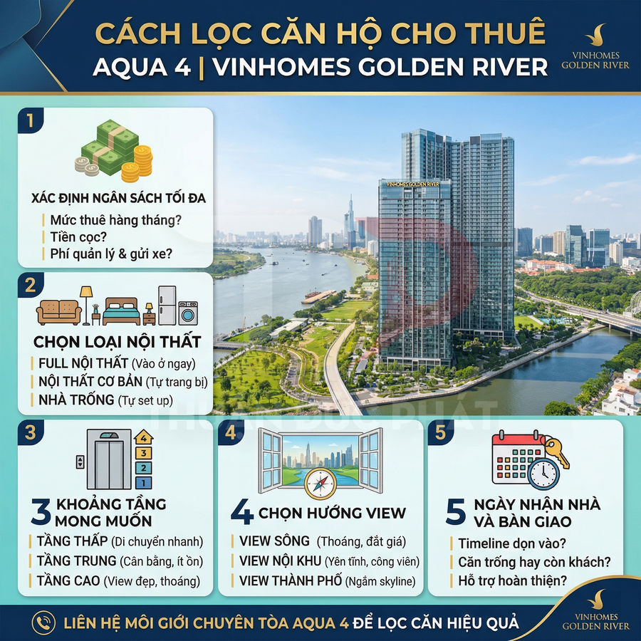 Các mức giá trên mang tính tham khảo và có thể thay đổi theo thời điểm, tình trạng căn hộ (mới nhận, đã ở, đã cải tạo), mức độ khan hiếm nguồn cung từng loại căn và nhu cầu thực tế của thị trường. Khi làm việc với môi giới chuyên tòa Aqua 4, khách thuê nên yêu cầu: