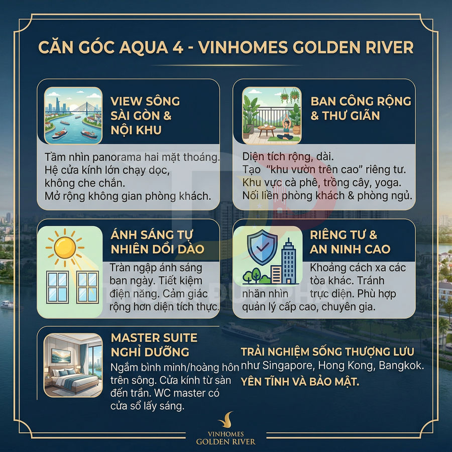Căn góc tại Aqua 4 là nhóm căn được săn đón nhiều nhất nhờ sở hữu hai mặt thoáng, tầm nhìn rộng, ánh sáng tự nhiên dồi dào và độ riêng tư cao hơn so với các căn giữa. Về mặt kiến trúc, các căn này thường được bố trí phòng khách tại vị trí góc, với hệ cửa kính lớn chạy dọc theo hai mặt, tạo hiệu ứng “panorama” mở ra view sông Sài Gòn và nội khu xanh mát. Nhờ đó, không gian phòng khách luôn tràn ngập ánh sáng ban ngày, giảm nhu cầu sử dụng đèn nhân tạo, đồng thời mang lại cảm giác rộng hơn so với diện tích thực.