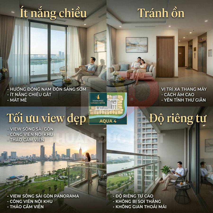 Khi thuê căn hộ Aqua 4, việc phân tích kỹ hướng căn, vị trí trên mặt bằng tầng và tương quan với các tòa xung quanh là yếu tố mang tính “quyết định chất lượng sống” hơn là chỉ nhìn vào diện tích hay số phòng. Ở khu Vinhomes Golden River, đặc thù mặt kính lớn, mật độ kính bao phủ cao nên hướng nắng và khả năng tản nhiệt của căn hộ ảnh hưởng trực tiếp đến chi phí điện, độ bền nội thất và cảm giác thoải mái khi ở.