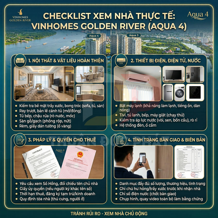 Khi đi xem nhà Aqua 4, nên chuẩn bị một checklist chi tiết để đánh giá căn hộ một cách khách quan, tránh bị cảm xúc nhất thời (như ấn tượng về mùi thơm, ánh sáng, decor) làm lu mờ các lỗi kỹ thuật hoặc pháp lý. Checklist nên chia thành các nhóm: nội thất – thiết bị, hệ thống kỹ thuật, pháp lý – hợp đồng, và tình trạng bàn giao.