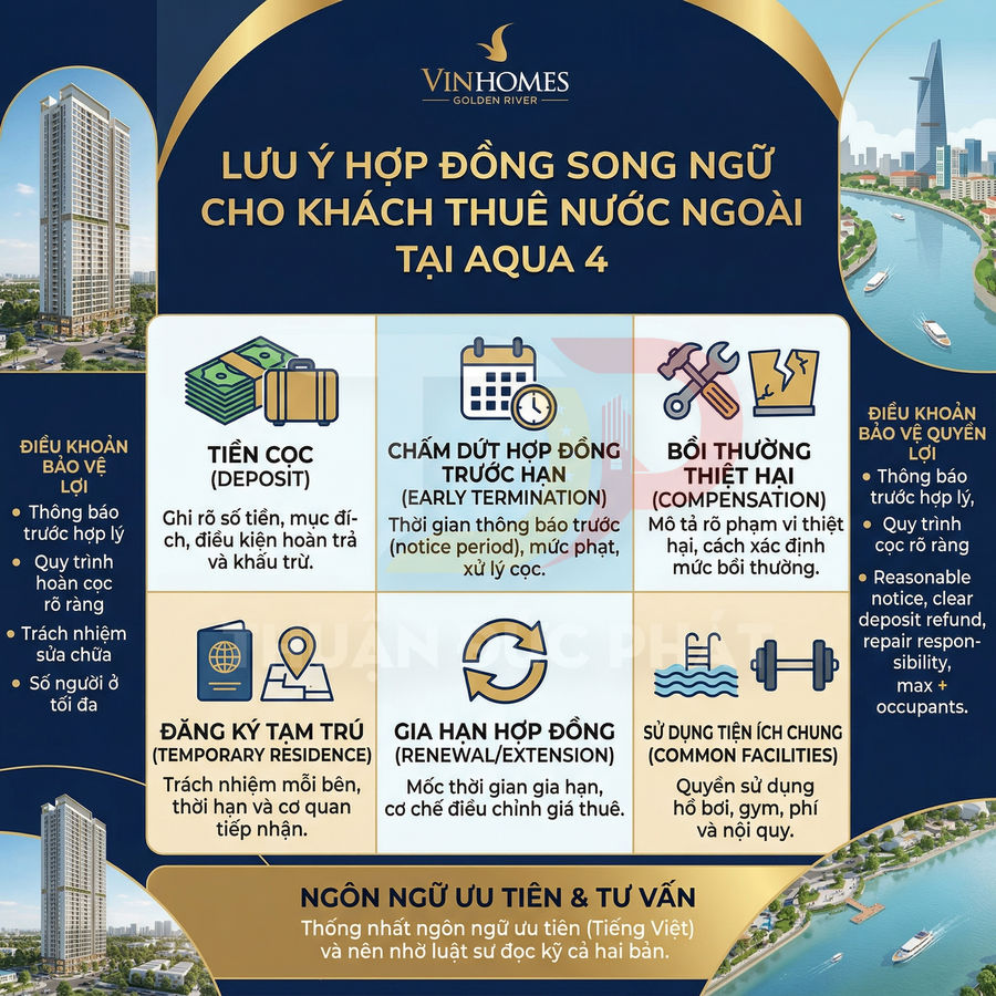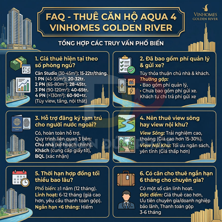 Hệ thống câu hỏi thường gặp xoay quanh việc thuê căn hộ Aqua 4 tập trung vào bốn nhóm chính: chi phí – hợp đồng – pháp lý – trải nghiệm sống. Về chi phí, người thuê quan tâm mức giá theo loại phòng ngủ, sự chênh lệch giữa căn view sông và view nội khu, cũng như việc giá thuê đã bao gồm phí quản lý, phí gửi xe hay chưa. Ở khía cạnh hợp đồng, các truy vấn phổ biến là thời hạn thuê tối thiểu, khả năng thuê ngắn hạn 6 tháng, điều kiện gia hạn, chấm dứt sớm và xử lý tiền cọc. Về pháp lý, khách – đặc biệt là người nước ngoài – chú ý đến hỗ trợ đăng ký tạm trú, hồ sơ cần chuẩn bị và trách nhiệm giữa chủ nhà, khách thuê, ban quản lý. Cuối cùng, người thuê cân nhắc giữa tối ưu ngân sách và chất lượng sống thông qua lựa chọn loại view, tầng, nội thất và độ linh hoạt thanh toán.