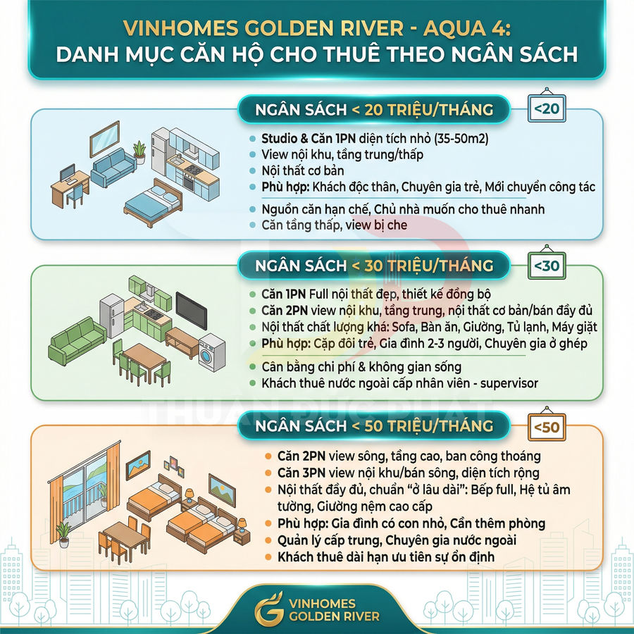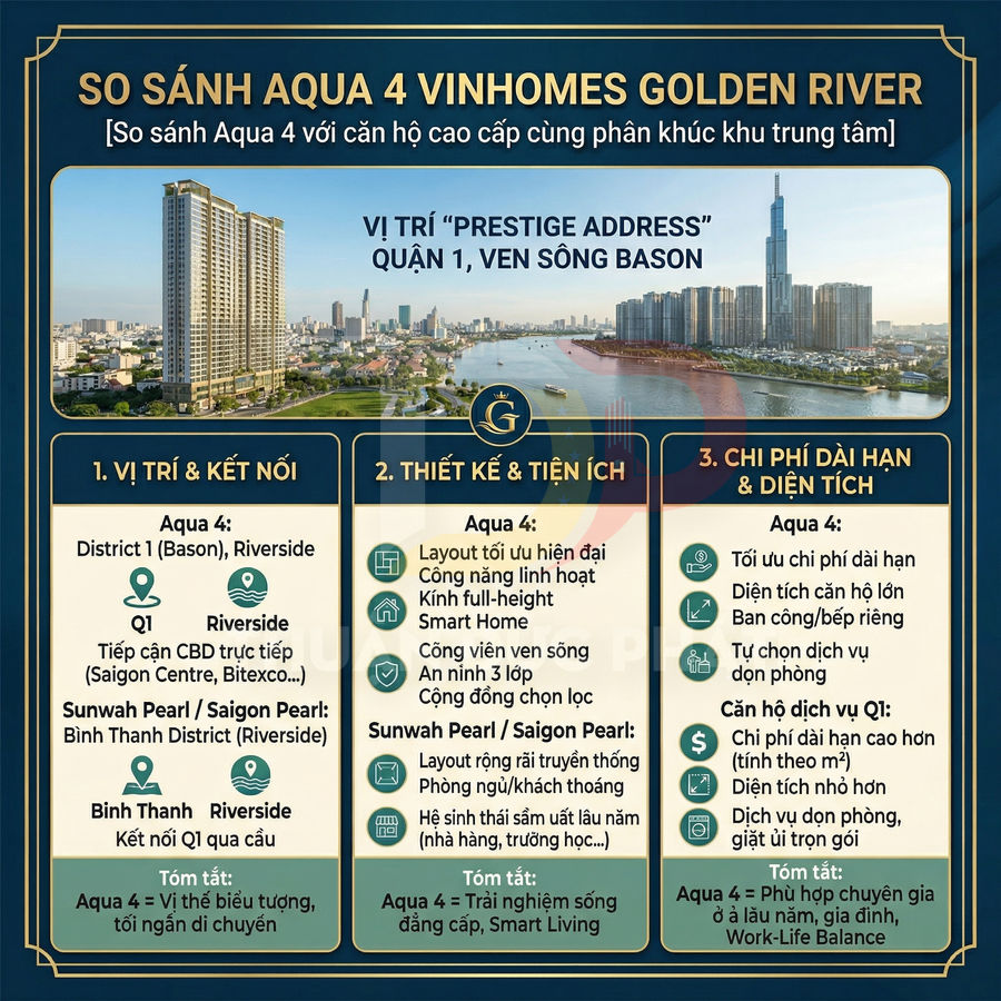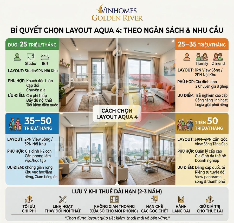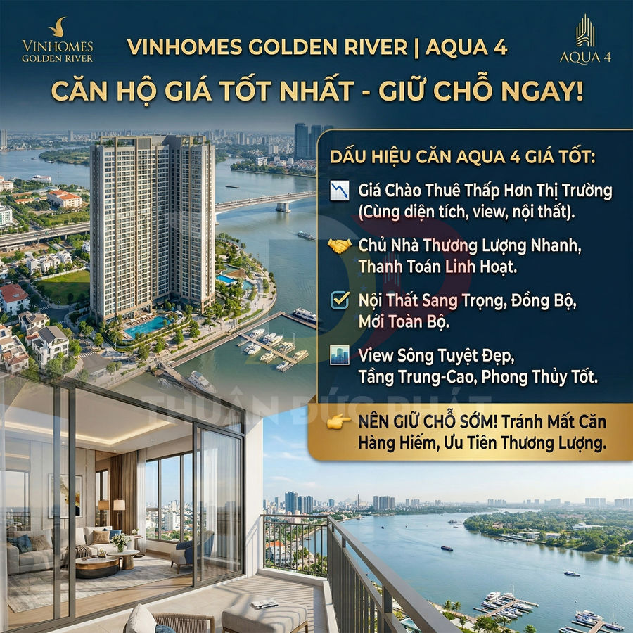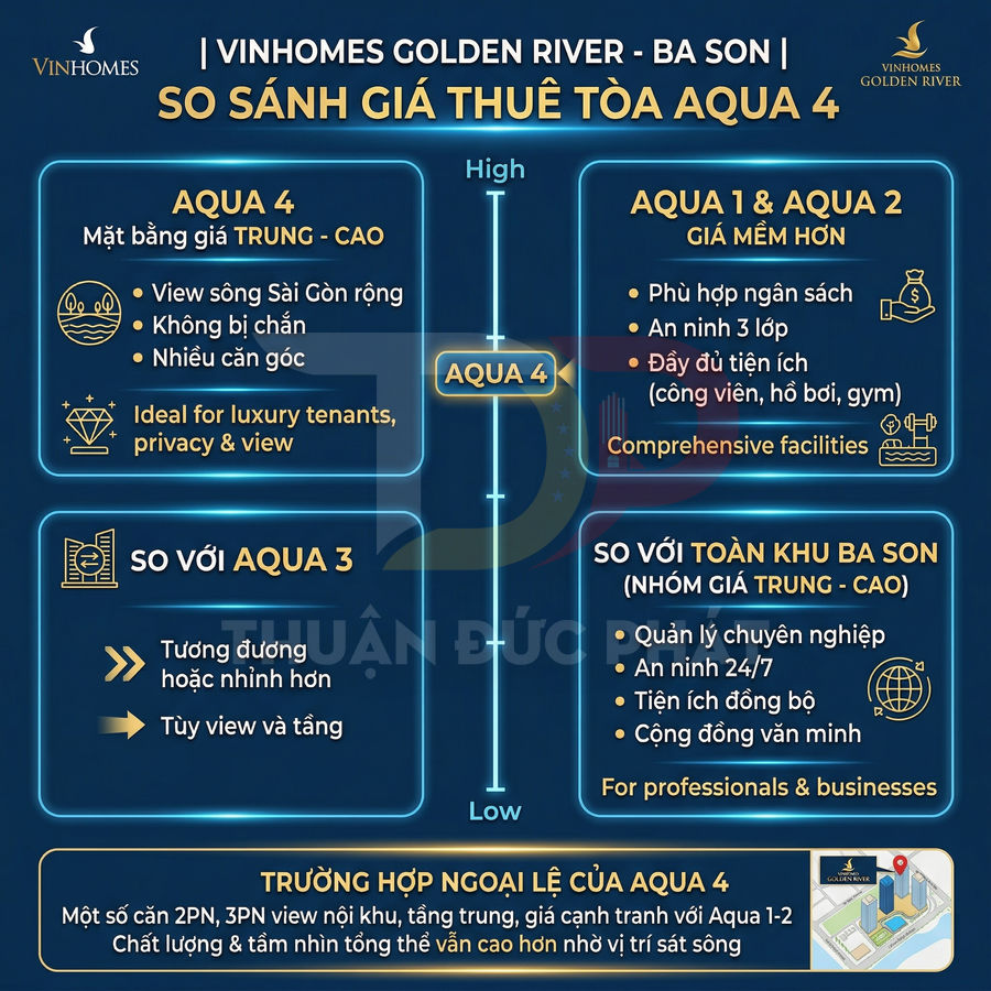 Aqua 1 và Aqua 2 có lợi thế về giá mềm hơn, phù hợp khách thuê ưu tiên ngân sách nhưng vẫn muốn trải nghiệm hệ sinh thái Vinhomes Golden River: an ninh 3 lớp, tiện ích nội khu, công viên ven sông, hồ bơi, phòng gym. Tuy nhiên, một số căn tại Aqua 4, đặc biệt là căn 2PN và 3PN view nội khu, tầng trung, nội thất cơ bản, lại có mức giá cạnh tranh, không chênh lệch quá nhiều so với Aqua 1–2, trong khi chất lượng tòa nhà, sảnh đón, hành lang, tầm nhìn tổng thể vẫn được đánh giá cao hơn nhờ vị trí sát sông.