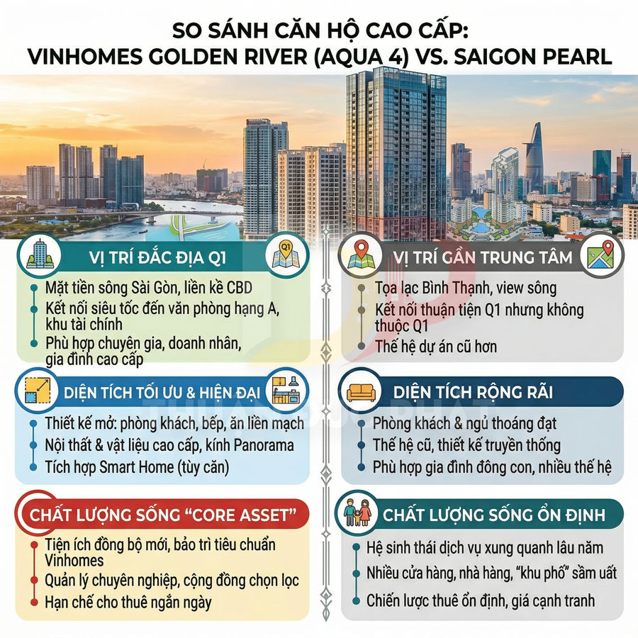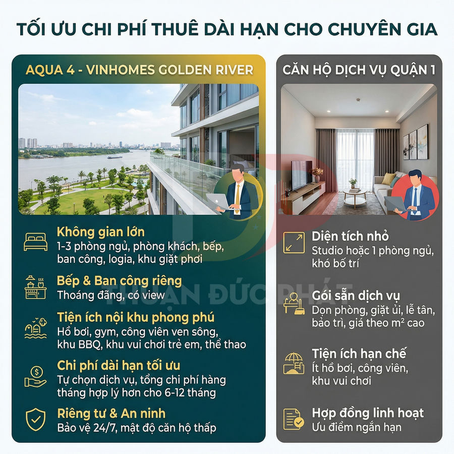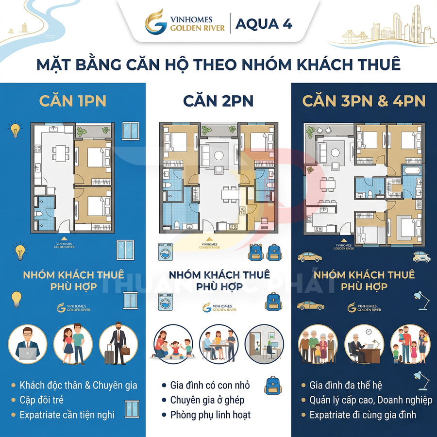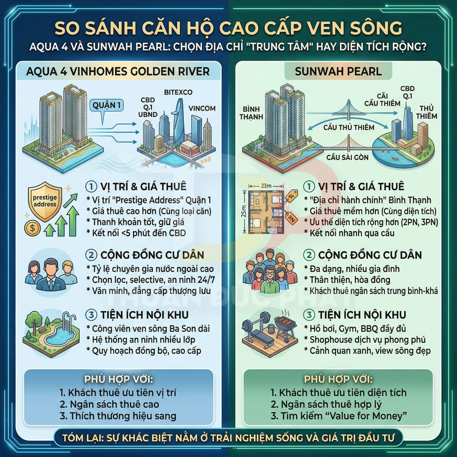Aqua 1 và Aqua 2 có lợi thế về giá mềm hơn, phù hợp khách thuê ưu tiên ngân sách nhưng vẫn muốn trải nghiệm hệ sinh thái Vinhomes Golden River: an ninh 3 lớp, tiện ích nội khu, công viên ven sông, hồ bơi, phòng gym. Tuy nhiên, một số căn tại Aqua 4, đặc biệt là căn 2PN và 3PN view nội khu, tầng trung, nội thất cơ bản, lại có mức giá cạnh tranh, không chênh lệch quá nhiều so với Aqua 1–2, trong khi chất lượng tòa nhà, sảnh đón, hành lang, tầm nhìn tổng thể vẫn được đánh giá cao hơn nhờ vị trí sát sông.