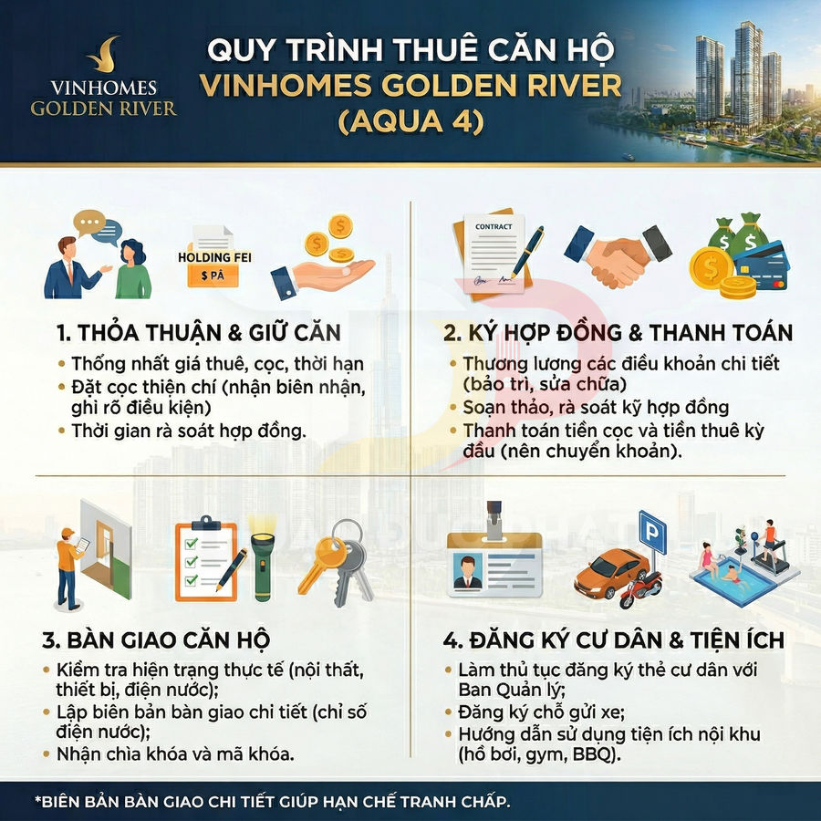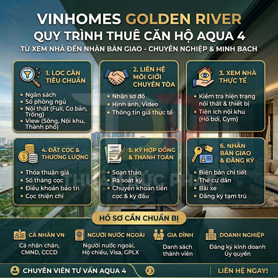 Quy trình thuê căn hộ Aqua 4 diễn ra theo chuỗi bước logic, bắt đầu từ việc xây dựng bộ tiêu chí tìm căn thật rõ ràng, sau đó làm việc có hệ thống với môi giới chuyên tòa để lọc nhanh các lựa chọn phù hợp. Người thuê cần xác định trước ngân sách, số phòng ngủ, tình trạng nội thất, tầng, hướng view và mốc thời gian nhận nhà, đồng thời chuẩn bị sẵn danh sách ưu tiên để rút ngắn số lần đi xem. Khi đã chọn được căn ưng ý, các bước giữ căn, đặt cọc, thương lượng điều khoản, ký hợp đồng, thanh toán và nhận bàn giao phải được thực hiện minh bạch, có biên bản và chứng từ đầy đủ. Cuối cùng, việc chuẩn bị hồ sơ cá nhân, gia đình hoặc doanh nghiệp đúng yêu cầu giúp quá trình đăng ký tạm trú, thẻ cư dân và bãi xe diễn ra nhanh chóng, hạn chế rủi ro pháp lý.