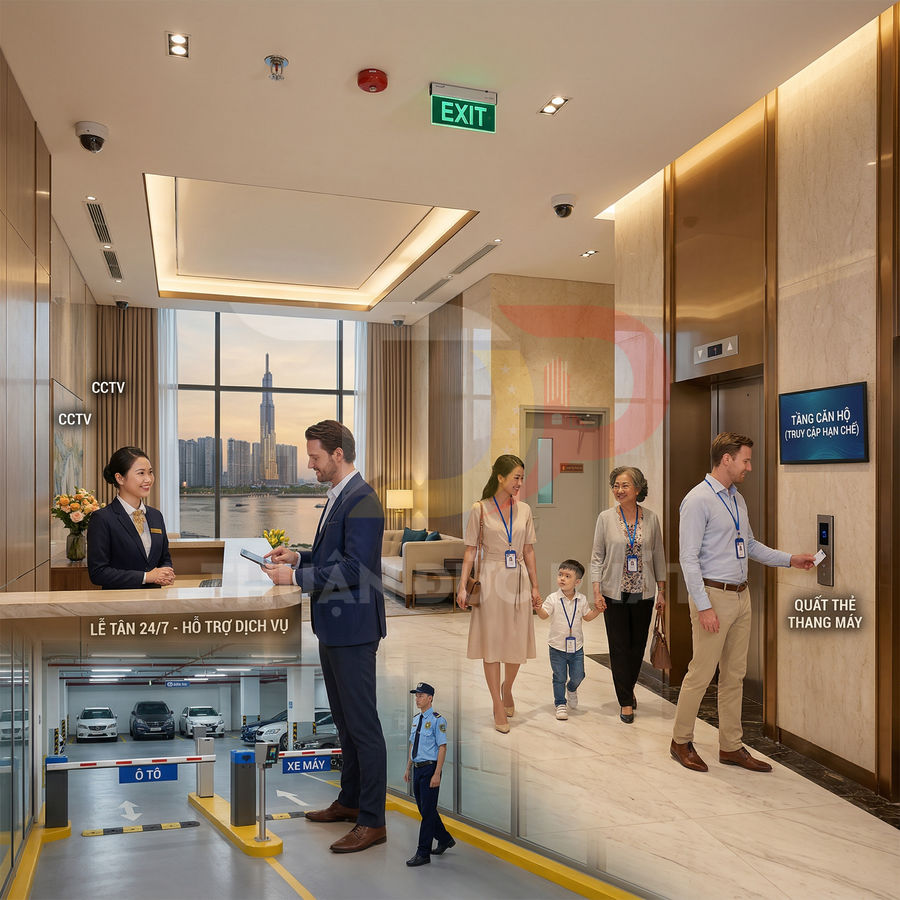 Cư dân sử dụng thẻ từ để ra vào tòa nhà, quẹt thẻ tại thang máy để lên đúng tầng căn hộ hoặc tầng tiện ích được phép. Cơ chế này giúp hạn chế tối đa người lạ di chuyển tự do trong tòa nhà, tăng mức độ an toàn cho gia đình có trẻ nhỏ, người lớn tuổi, cũng như khách thuê là chuyên gia nước ngoài thường xuyên vắng nhà vì công tác.