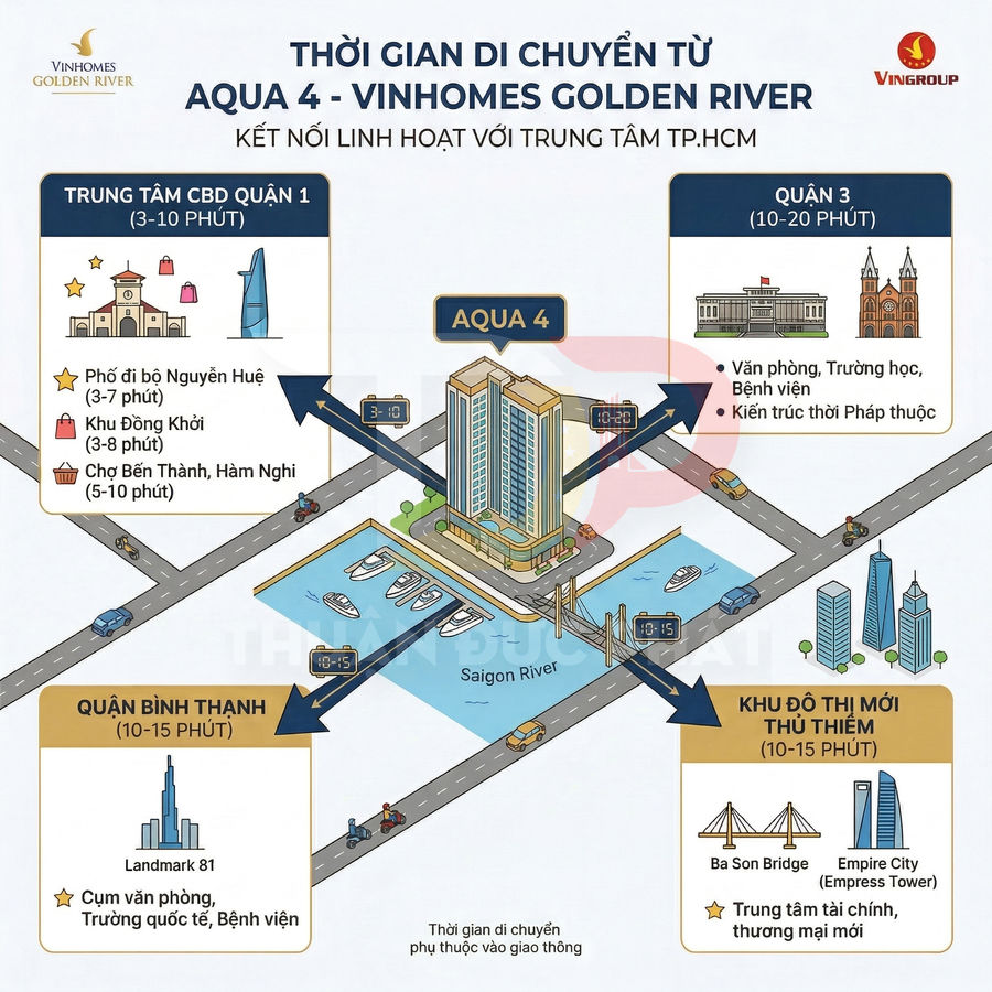 Về hướng Thủ Thiêm, Aqua 4 được hưởng lợi từ mạng lưới cầu và đường ven sông đang ngày càng hoàn thiện. Cư dân có thể di chuyển qua khu đô thị mới Thủ Thiêm thông qua cầu Thủ Thiêm 1, cầu Thủ Thiêm 2 (khi hoàn thiện), hoặc các tuyến đường ven sông kết nối với đại lộ Mai Chí Thọ. Thời gian di chuyển đến các khu vực trọng điểm của Thủ Thiêm, nơi quy hoạch trung tâm tài chính – thương mại – dịch vụ mới của thành phố, dao động khoảng 10–15 phút, phù hợp với nhu cầu làm việc, giao dịch, tham dự hội nghị, hội thảo của giới tài chính – ngân hàng – công nghệ.