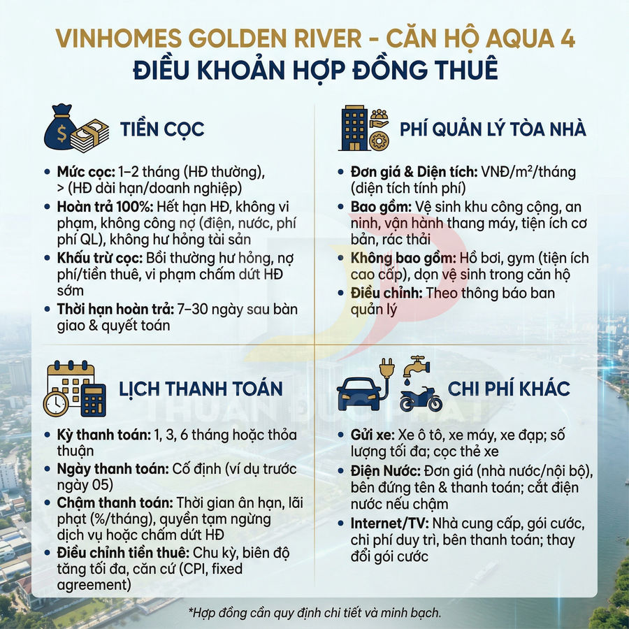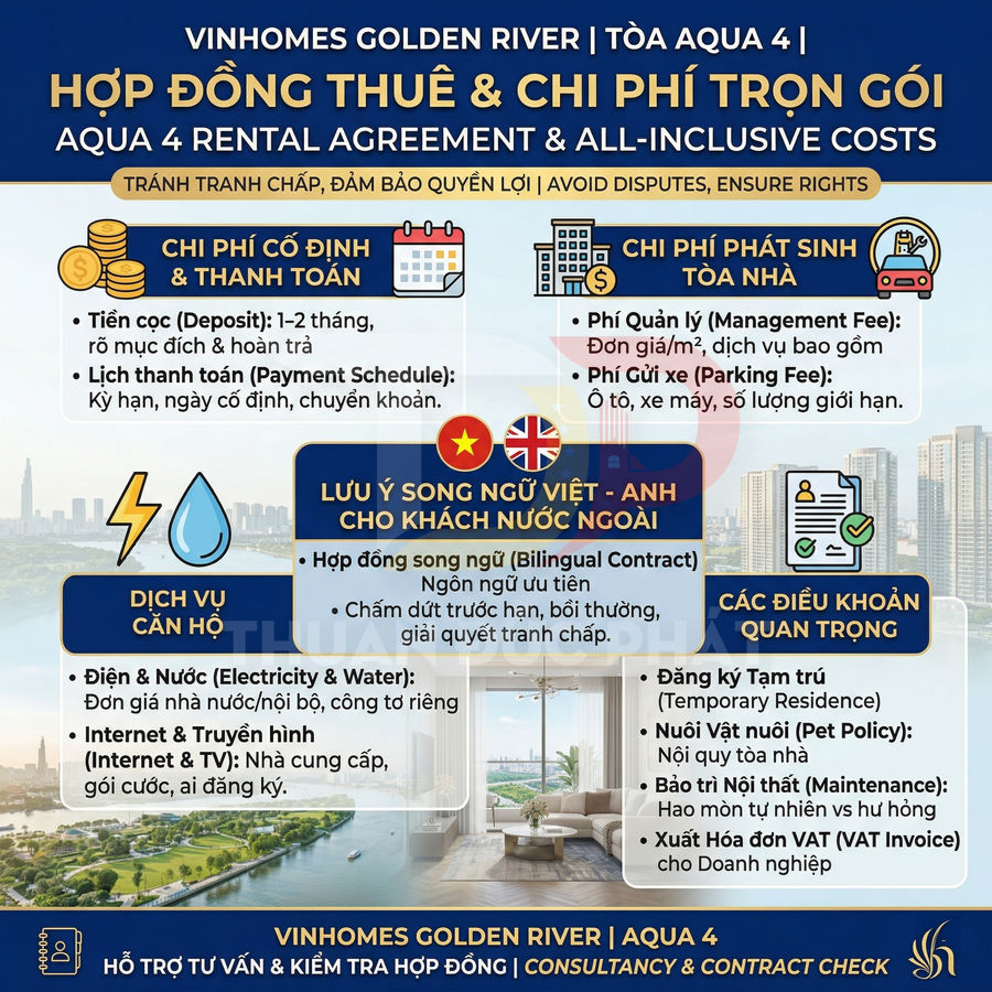 Về mặt khai thác thuê, nội dung cũng nhấn mạnh kinh nghiệm chọn căn theo ngân sách, hướng nắng, độ ồn, chất lượng nội thất, điều khoản hợp đồng và chi phí phát sinh để tối ưu hiệu quả tài chính. Tổng thể, Aqua 4 là dòng căn hộ “giữ giá tốt – dễ cho thuê – phù hợp nhiều tệp khách cao cấp”, nổi bật ở cả giá trị an cư lẫn khai thác cho thuê dài hạn.