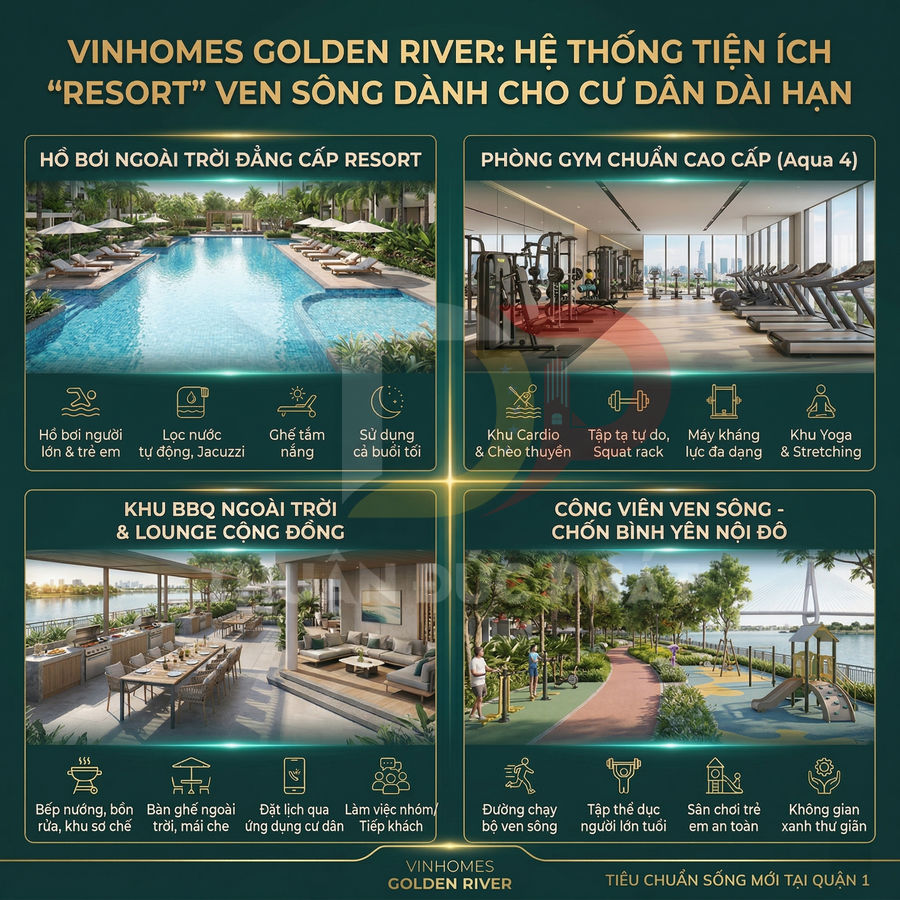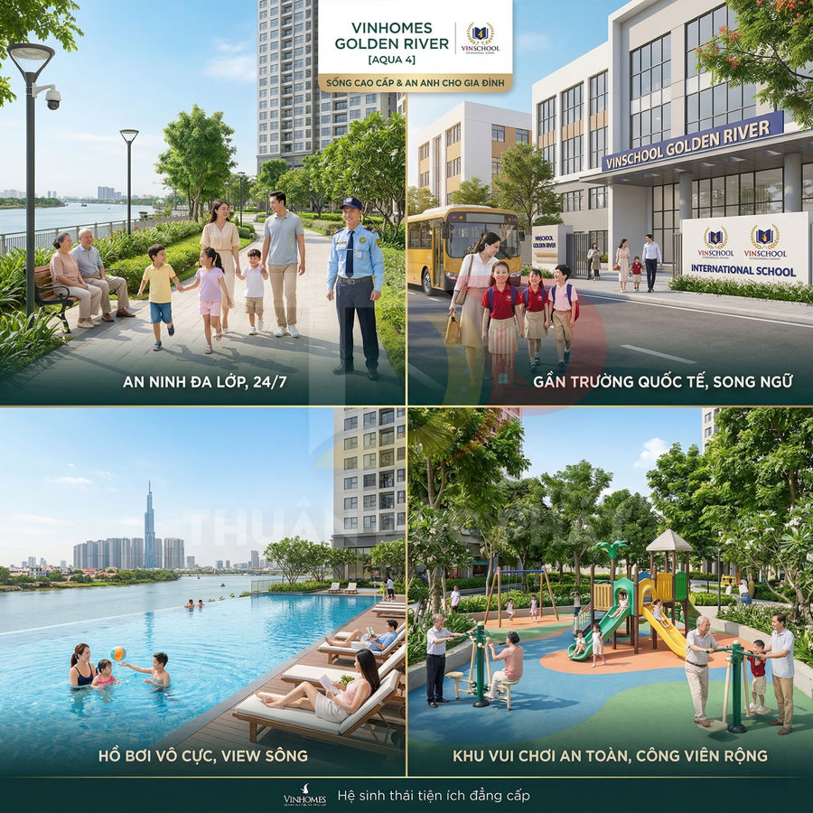 Cư dân Aqua 4 được thụ hưởng trọn vẹn hệ thống tiện ích nội khu đồng bộ của Vinhomes Golden River, được quy hoạch theo tiêu chuẩn khu nghỉ dưỡng đô thị cao cấp, hướng đến nhóm khách thuê dài hạn, chuyên gia và gia đình có yêu cầu khắt khe về chất lượng sống. Toàn bộ cụm tiện ích được bố trí theo trục cảnh quan ven sông, kết nối trực tiếp với sảnh tòa nhà, giúp cư dân di chuyển thuận tiện, hạn chế tối đa giao cắt với luồng giao thông bên ngoài.
