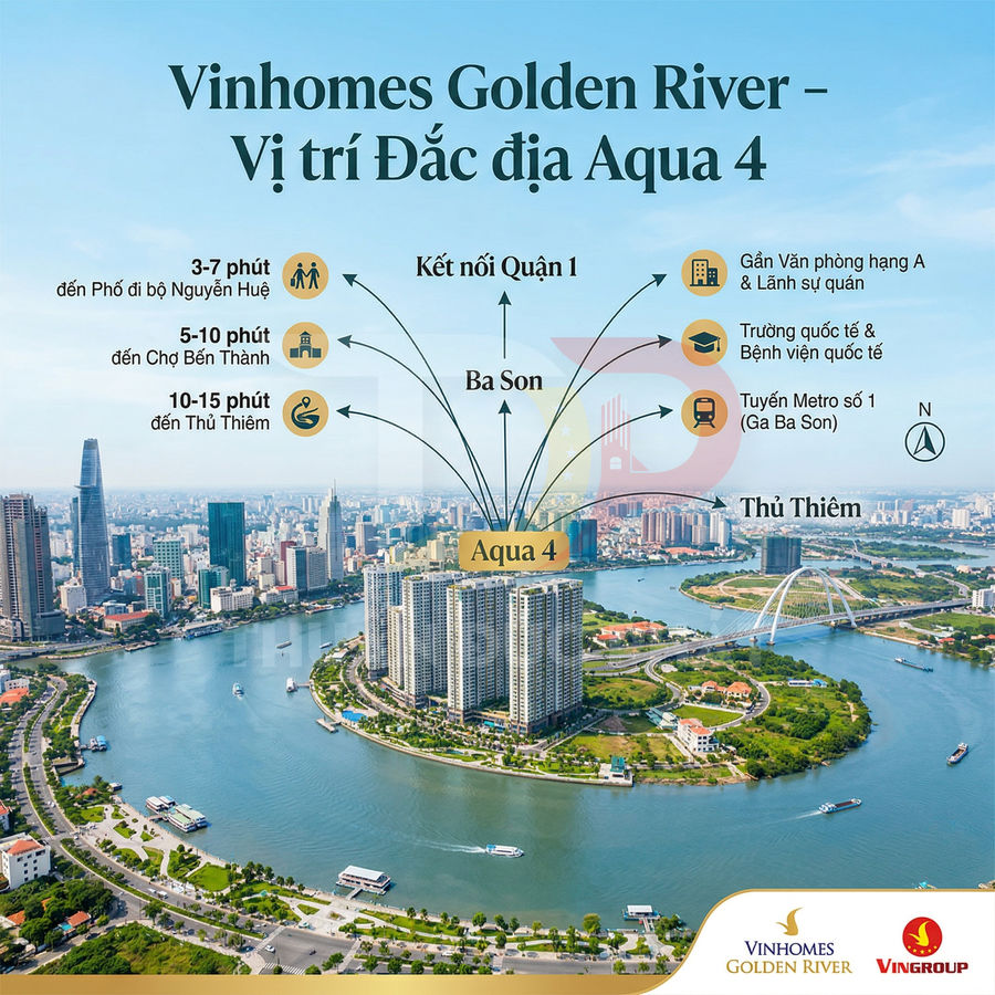 Aqua 4 thuộc phân khu Aqua của khu đô thị Vinhomes Golden River, tọa lạc trên trục đường Tôn Đức Thắng – Ba Son, tiếp giáp trực diện sông Sài Gòn và liền kề khu lõi trung tâm hành chính – tài chính của Quận 1. Vị trí này được đánh giá là một trong những “tọa độ vàng” hiếm hoi còn lại tại trung tâm TP.HCM, khi vừa sở hữu mặt tiền sông, vừa kết nối trực tiếp với các trục giao thông huyết mạch như Tôn Đức Thắng, Lê Duẩn, Nguyễn Hữu Cảnh, cầu Thủ Thiêm.
