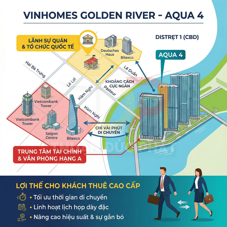Vị trí của Aqua 4 đặc biệt phù hợp với nhóm khách thuê làm việc tại các tòa nhà văn phòng hạng A trong khu CBD Quận 1. Trong bán kính ngắn, cư dân có thể tiếp cận nhanh các tòa nhà như Vietcombank Tower, Saigon Centre, Bitexco Financial Tower, Lim Tower, Deutsches Haus, cùng nhiều cao ốc văn phòng hạng A và hạng B+ khác dọc các trục Lê Lợi, Hàm Nghi, Nam Kỳ Khởi Nghĩa, Lê Duẩn. Việc di chuyển chỉ mất vài phút bằng ô tô, taxi, xe công nghệ hoặc thậm chí có thể di chuyển bằng xe đạp, xe điện nội khu, giúp giảm đáng kể áp lực giao thông và thời gian kẹt xe.