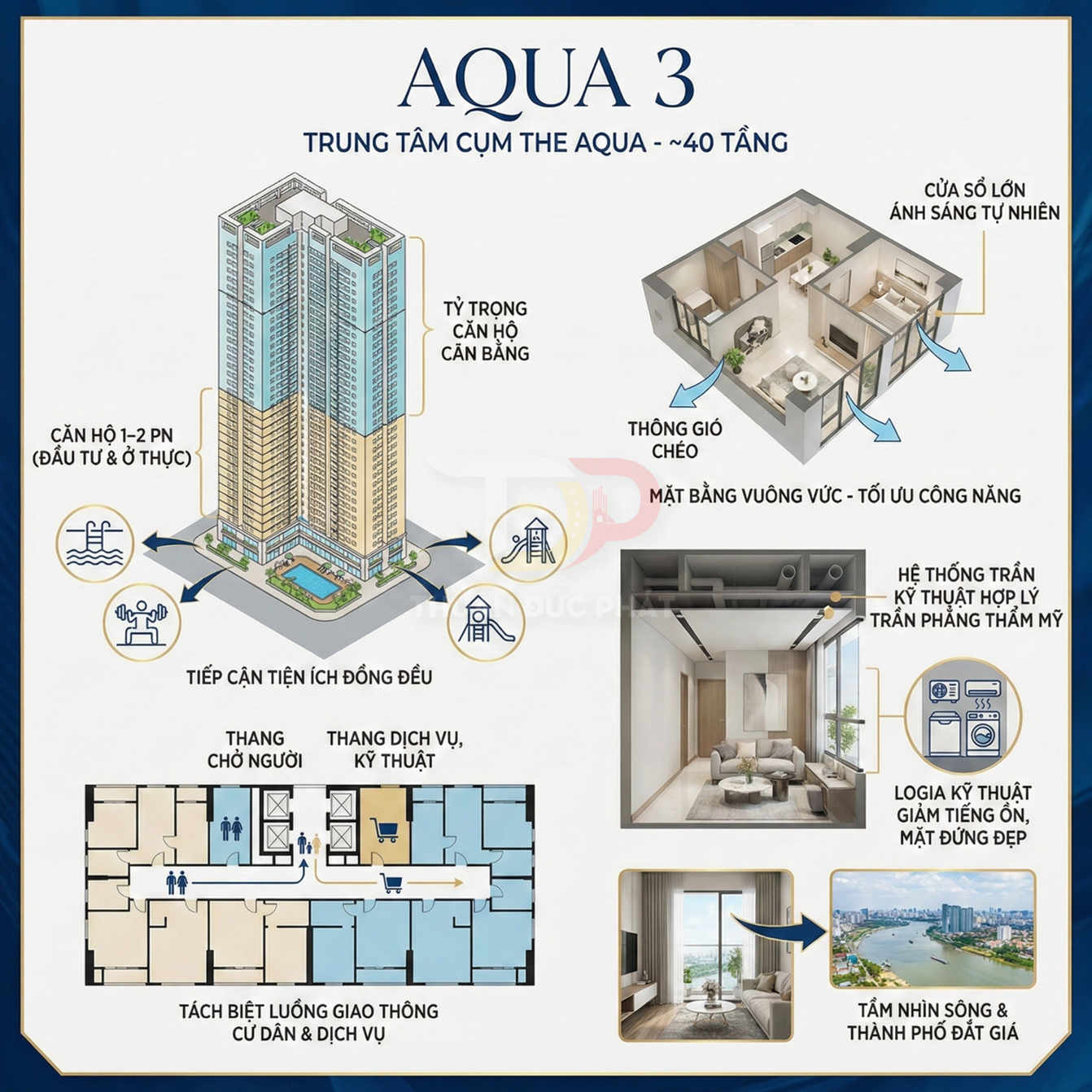 Về mặt thiết kế kiến trúc, The Aqua ưu tiên các mảng kính lớn, ban công rộng, lan can kính hoặc kim loại sơn tĩnh điện, giúp tăng diện tích tiếp xúc với ánh sáng tự nhiên và mở rộng tầm nhìn. Mặt bằng điển hình thường có nhiều căn góc, các trục căn hộ được bố trí để hạn chế tối đa việc nhìn trực diện vào căn hộ đối diện, tăng tính riêng tư. Các căn hộ 2–3 phòng ngủ tại đây thường được ưa chuộng bởi khách hàng gia đình trẻ, chuyên gia nước ngoài, nhờ sự cân bằng giữa diện tích, tầm nhìn và chi phí vận hành.