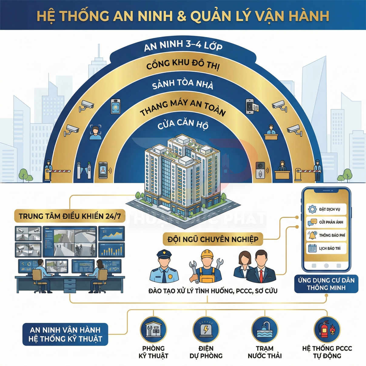 Công nghệ quản lý tòa nhà thông minh được áp dụng xuyên suốt, từ kiểm soát ra vào bằng thẻ từ, mã QR, nhận diện khuôn mặt, đến hệ thống camera an ninh, quản lý bãi xe, giám sát PCCC, đo đếm năng lượng. Dữ liệu được tập trung tại trung tâm điều khiển (control room), cho phép đội ngũ vận hành: