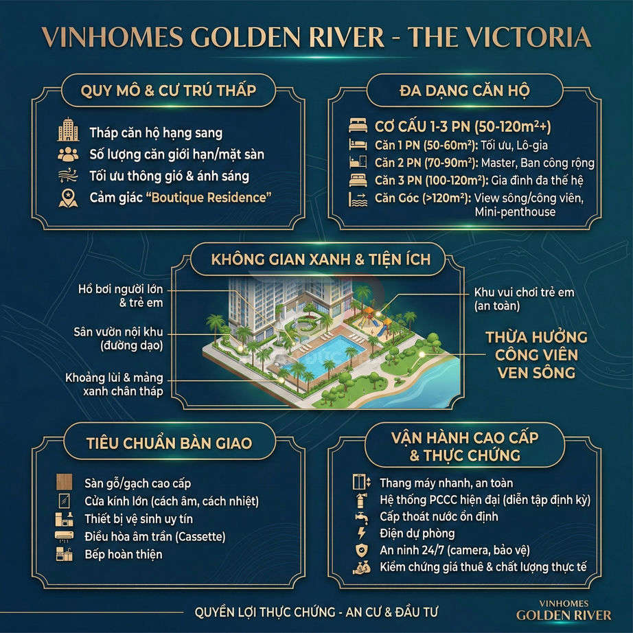 The Victoria được xem là phân khu phát triển ở giai đoạn sau của dự án, với tiêu chuẩn hoàn thiện được nâng cấp và định vị cao cấp hơn so với mặt bằng chung. Số lượng sản phẩm trong phân khu này thường giới hạn, tập trung vào các căn hộ diện tích lớn, căn góc, penthouse hoặc các sản phẩm có tính độc bản cao, hướng đến nhóm khách hàng thượng lưu và nhà đầu tư dài hạn.