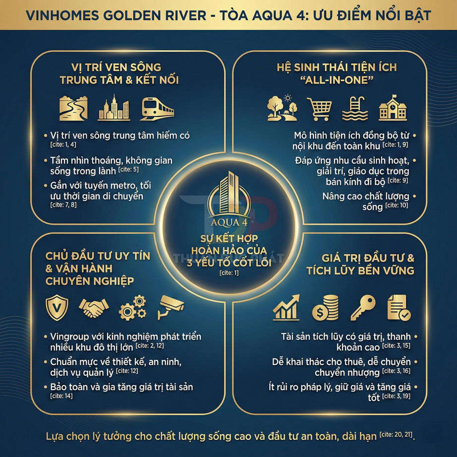Sự cộng hưởng của các yếu tố vị trí, quy mô, hạ tầng và chất lượng vận hành giúp tài sản tại Vinhomes Golden River duy trì sức hấp dẫn trong dài hạn, cả về giá trị sử dụng lẫn giá trị đầu tư. Đối với nhà đầu tư chuyên nghiệp, dự án không chỉ là một sản phẩm đơn lẻ mà là một “thị trường con” với đầy đủ dữ liệu giao dịch, cho thuê, tỷ lệ lấp đầy, cho phép xây dựng các mô hình phân tích dòng tiền, lợi suất, rủi ro một cách bài bản. Trong bối cảnh quỹ đất trung tâm ngày càng khan hiếm, một quần thể 25,3 ha với 13 tòa tháp ven sông mang ý nghĩa như một tài sản chiến lược, có khả năng bảo toàn và gia tăng giá trị qua nhiều chu kỳ thị trường.
